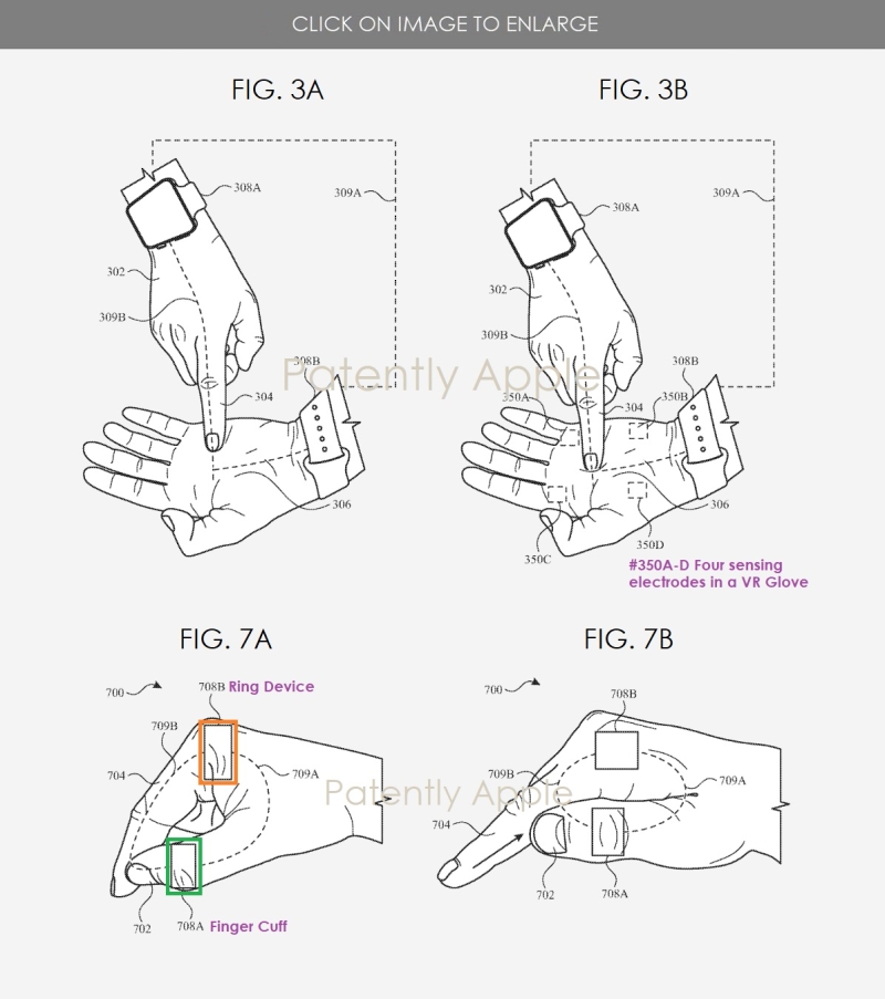 이미지 확대보기애플의 예시 사진을 보면 팔찌 형태와 반지 형태 두 가지 버전으로 보인다. 페어턴틀리 애플은 이번 애플링 특허가 혼합현실 장갑으로 구현될 수도 있다고 전했다.