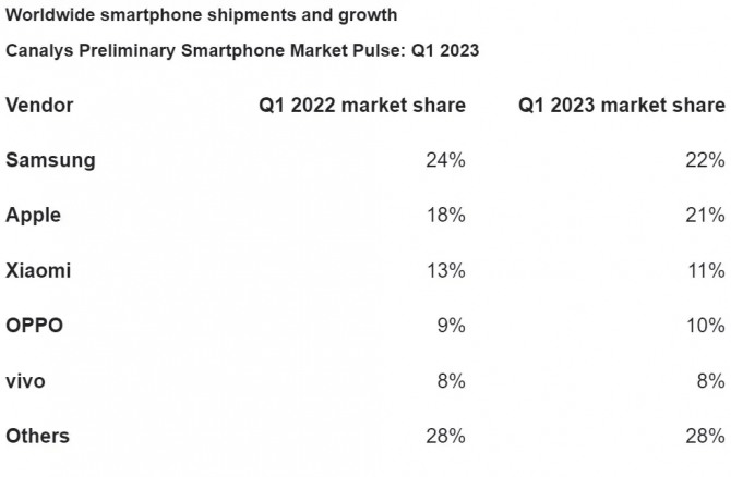 이미지 확대보기시장조사업체 카날리스에 따르면 삼성전자는 올해 1분기 세계 스마트폰 판매량 22%를 차지하며 1위에 올랐다. 이는 전년 동기 대비 2%p 줄어든 수준이다. 반면 애플은 전년 동기 대비 3%p 늘어난 21%로 2위를 지켰다.