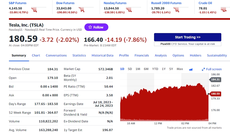이에대해 테슬라는 "1분기에 전 지역에 걸쳐 여러 차량 모델에 대해 가격 인하를 시행했지만, 영업이익률은 감당할 만한 수준으로 줄었다"며 "우리는 새 공장들의 생산 효율성 향상과 물류비용 감소를 포함해 지속적인 비용 절감을 기대하고 있다"고 밝혔다. 그러면서 차량 생산을 가능한 한 빨리 늘려 올해 연간 인도량 180만대를 달성하겠다는 목표를 재확인했다. 테슬라의 향후 실적에 대해 부정적인 전망이 나오면서 하루전 미국 뉴욕증시에서 테슬라 주가는 전날보다 2.02% 떨어졌다. 시간외거래에서도 6.06% 하락해 169.65달러가 됐다. 이후 20일 시간전 거래에서도 추가 하락 하고 있다. <그림 도표 참조>