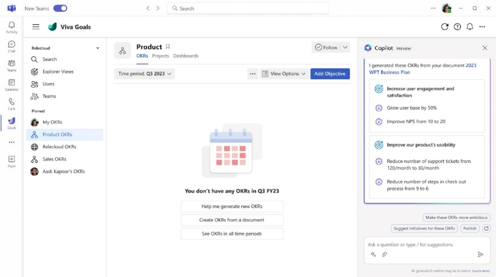 목표 설정을 돕는 ‘비바 골’ 앱에 코파일럿이 적용됐다. ‘비바 골 코파일럿’은 리더에게 OKR (Objective and Key Results) 작성 프로세스를 안내하고 조직 전체의 목표 관리를 간소화함으로써 목표 설정을 단순하게 한다. 연간 사업 계획서, 제품 전략서 등과 같은 워드 문서에 기반해 OKR 초안을 제안한다.