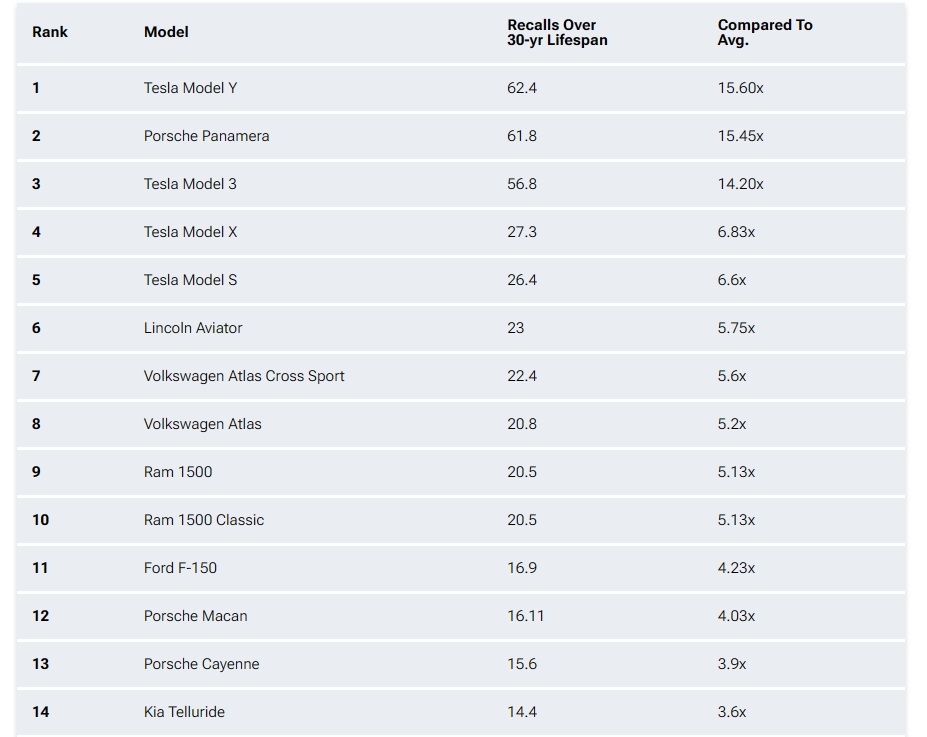 한편, 테슬라 모델Y는 같은 기간 동안 평균 리콜 횟수의 15.6배에 달하는 62.4건의 리콜 횟수가 예상됐다. 다만 이 수치에는 차주에게 특별히 불편을 초래하지 않는 무선 업데이트도 포함됐다.