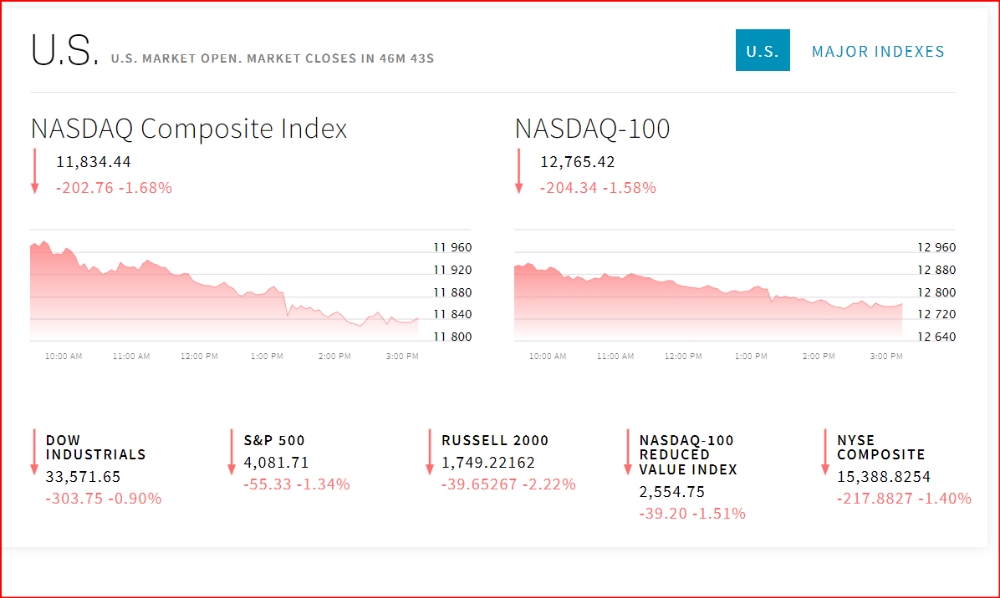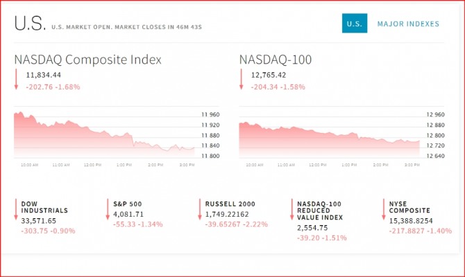 이미지 확대보기26일 뉴욕증시는 기업들의 실적 발표 속에 큰 폭으로 떨어지고 있다. 뉴욕증권거래소(NYSE)에서 다우존스30산업평균지수와 스탠더드앤드푸어스(S&P)500지수 그리고 나스닥지수 모두 떨어지고 있다. 실적 발표 이후 퍼스트리퍼블릭은행의 주가는 폭락했다. 회사의 예금이 1분기에 40% 줄어들었다는 소식이 투자 심리를 악화시켰다. 퍼스트리퍼블릭은 실리콘밸리은행(SVB)과 시그니처은행의 파산 이후 지역 은행들의 재무 상태를 확인하기 위해 투자자들이 주목해왔던 은행 중 한 곳이다. 퍼스트 리퍼블릭의 주가는 올해 들어 이미 86% 이상 하락했다.