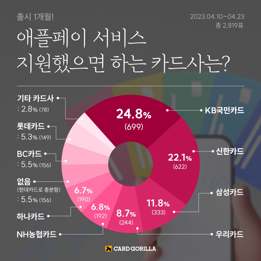 이미지 확대보기26일 신용카드 플랫폼 카드고릴라가 ‘애플페이 추가 원하는 카드사는?’이라는 주제의 설문조사 결과를 발표했다. 이번 설문조사는 카드고릴라 웹사이트 방문자들을 대상으로 4월 10일부터 4월 23일까지 약 2주간 실시했으며, 총 2819명이 참여했다.