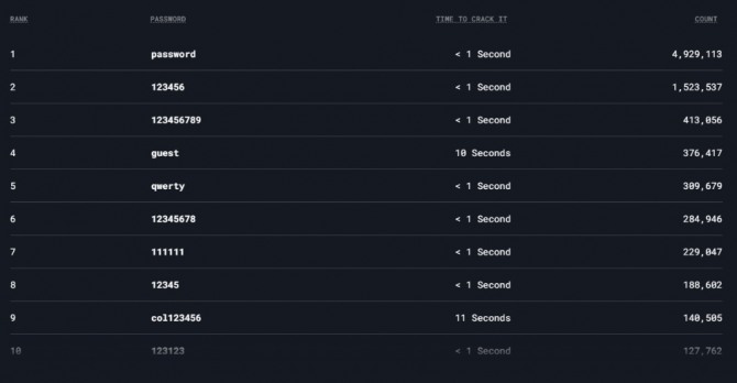 2위는 ‘123456’이었던 것으로 확인됐고 ‘123456789’ ‘guest’ ‘qwerty’ ‘12345678’ ‘111111’ ‘12345’ 등이 그 뒤를 이은 것으로 집계됐다.