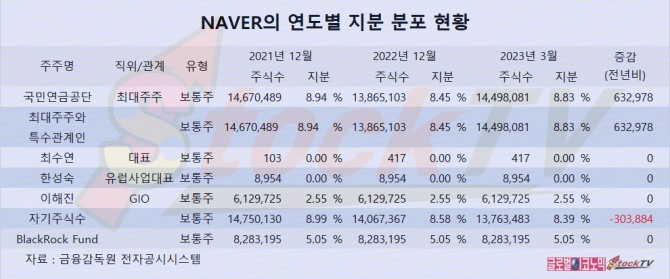 [그래픽] 네이버 1분기보고서, 국민연금 지분 0.38%p 늘려…자사주 30만주 처분