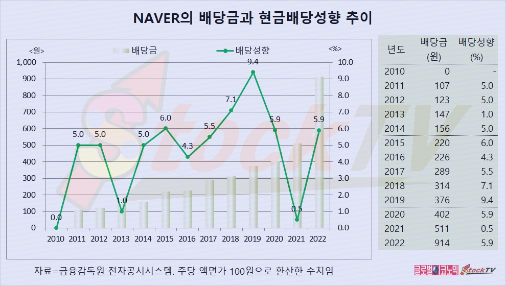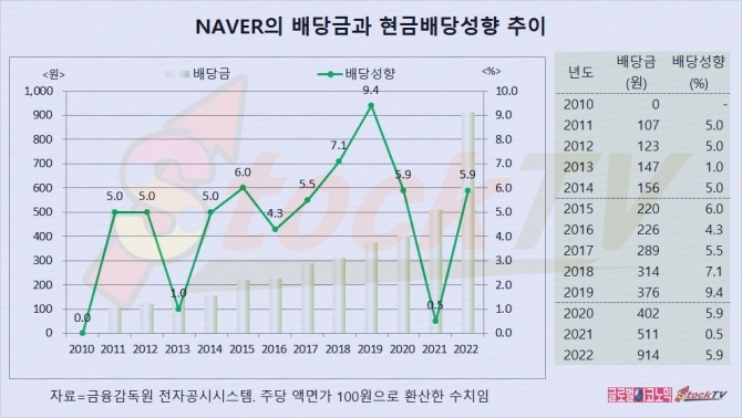 네이버는 2022년에 1주당 914원의 배당금을 지급했습니다. 연결현금배당성향은 5.9%에 이릅니다.
