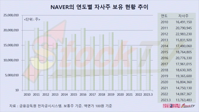 네이버는 2023년 3월 기준으로 자기주식을 1376만3483주 보유하고 있습니다.