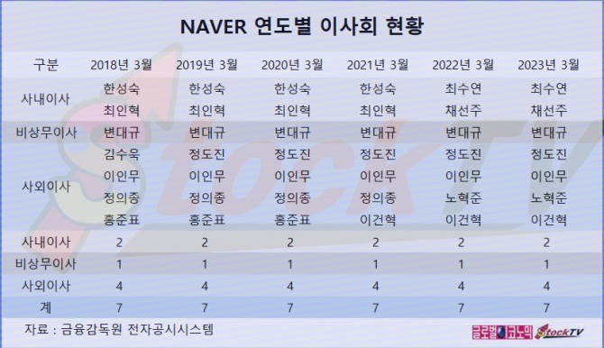 네이버 이사회는 사내이사 2명, 기타비상무이사 1명, 사외이사 4명 등 모두 7명으로 구성되어 있습니다.