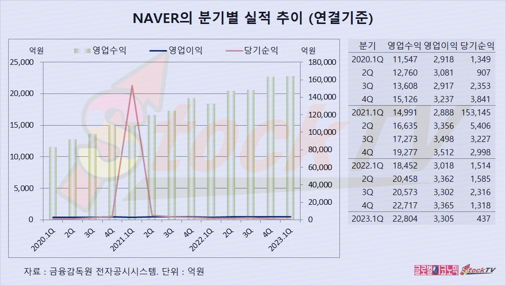 네이버(NAVER)는 12일 2023년 1분기 분기보고서를 금융감독원 전자공시시스템에 공시했습니다. 네이버의 분기별 실적은 영업수익(매출액)이 증가하고 있으나 당기순이익은 급락했습니다.