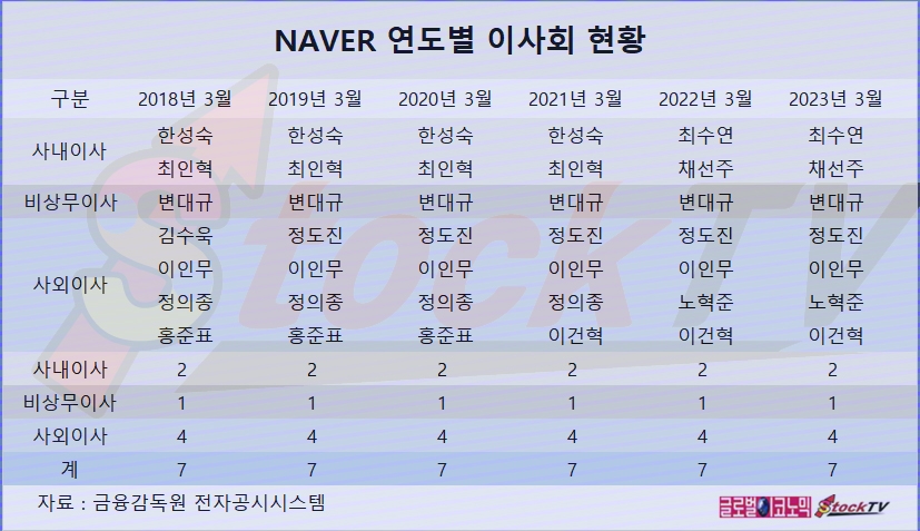 네이버 사외이사는 정도진 중앙대학교 경영대학 회계학 교수(롯데하이마트 사외이사 겸직), 이인무 KAIST 경영대학 재무학 교수(GS홈쇼핑 사외이사 겸직), 노혁준 서울대 법학전문대학원 교수, 이건혁 신한금융그룹 미래전략연구소 대표로 구성되어 있습니다.