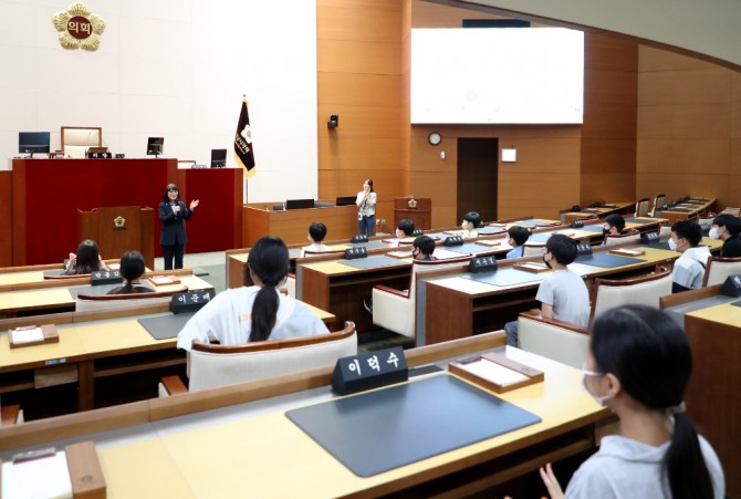 경기도 성남시의회 홍보관을 견학온 불곡초등학교 6학년 학생 26명이 박은미 부의장의 환영 인사를 받으며 시의회 주요 시설물에 대해 체험하는 시간을 가졌다.