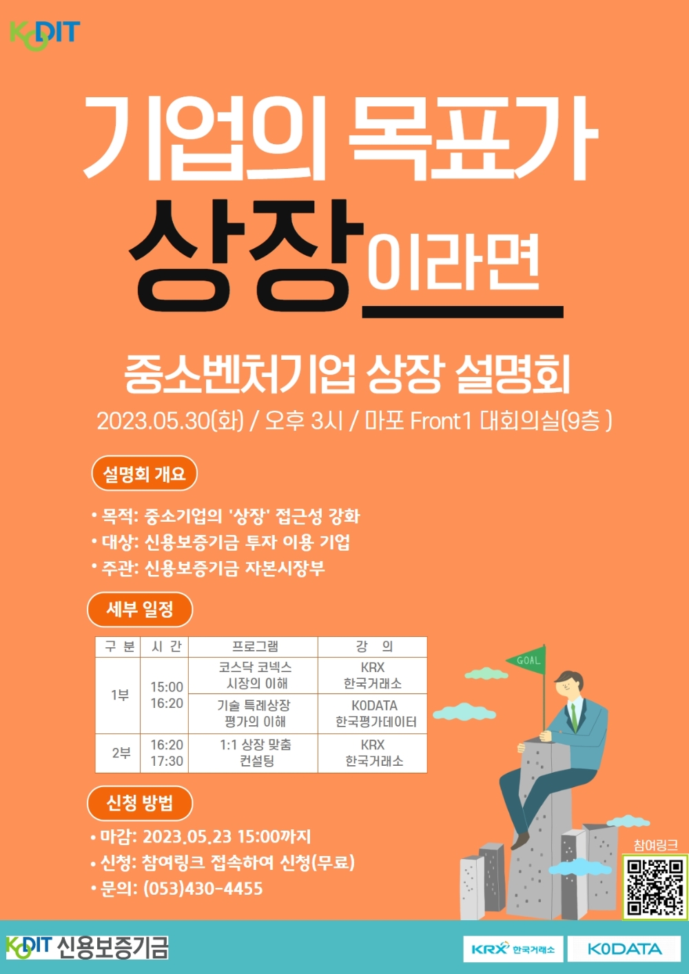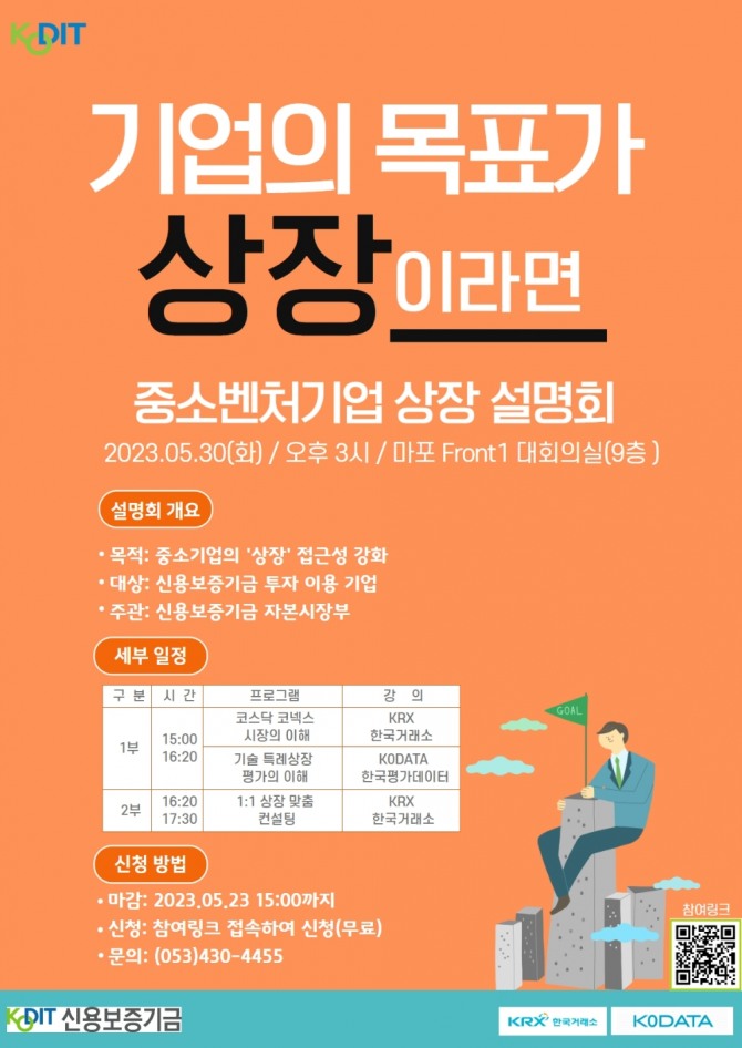 상장에 관심이 있는 신보 투자 이용기업은 상장설명회 포스터의 참여링크 접속을 통해 무료로 신청할 수 있으며, 신청기한은 5월 23일 오후 3시까지이다.