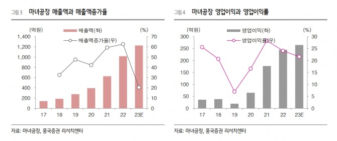 마녀공장은 지난 2022년 사상 최대 매출액인 1018억 원, 영업이익 245억 원을 기록했다. 흥국생명의 보고서에는 23년 예상 실적을 전년 대비 각각 20.5%, 7.7% 성장한 매출액 1,227억 원, 영업이익 265억 원으로 전망한 바 있다.