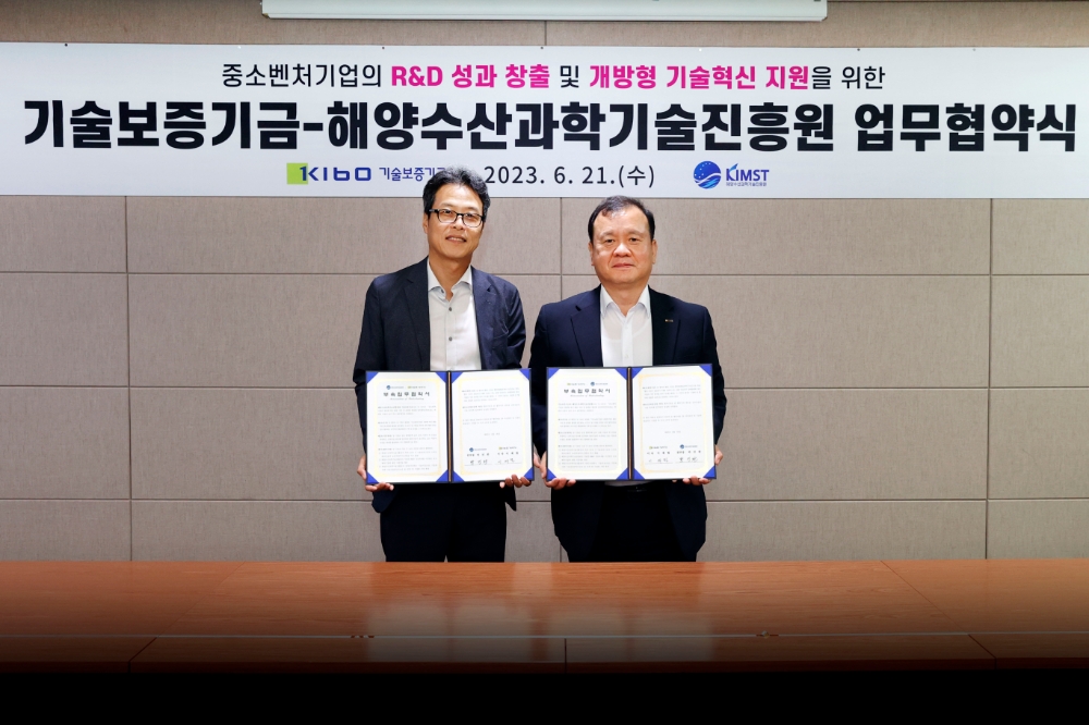 기술보증기금은 해양수산과학기술진흥원(KIMST)과 21일 부산 기보 본점에서 해양수산과학 R&D 성과 창출과 중소벤처기업의 개방형 기술혁신 지원을 위한 업무협약을 체결했다고 밝혔다.
