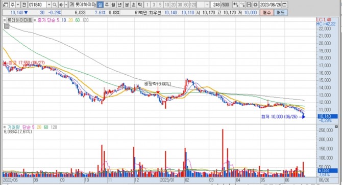 이미지 확대보기롯데하이마트의 주가는 26일 오전 9시 20분 현재 전일보다 30원(0.29%) 내린 1만140원에 매매되고 있습니다. 장중에는 52주 신저가 1만원을 찍었습니다.