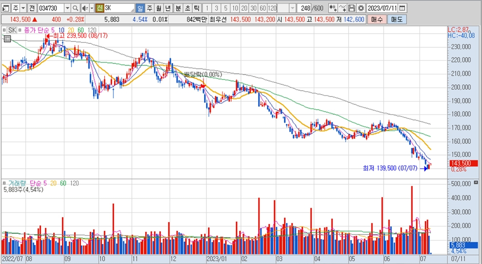 SK의 지난 1년여간 주가 변동 추이. 키움증권 HTS 캡처이미지 확대보기