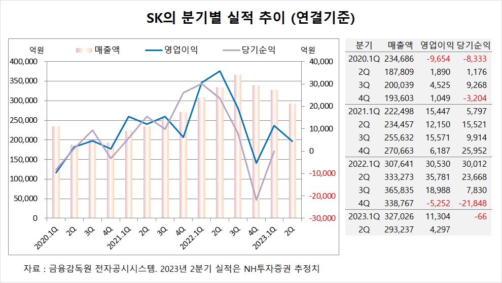 NH투자증권은 SK의 2분기 연결기준 매출액이 29조3237억원, 영업이익이 4297억원에 이를 것으로 내다보고 있습니다. 2분기 영업이익은 시장 컨센서스인 9060억원을 크게 하회할 전망입니다.