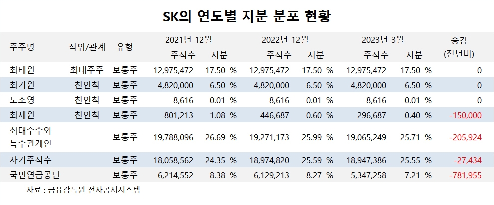SK는 최태원 회장의 동생인 최재원 수석부회장이 올해들어 주식을 15만주 장내 매각하며 지분을 낮췄습니다.