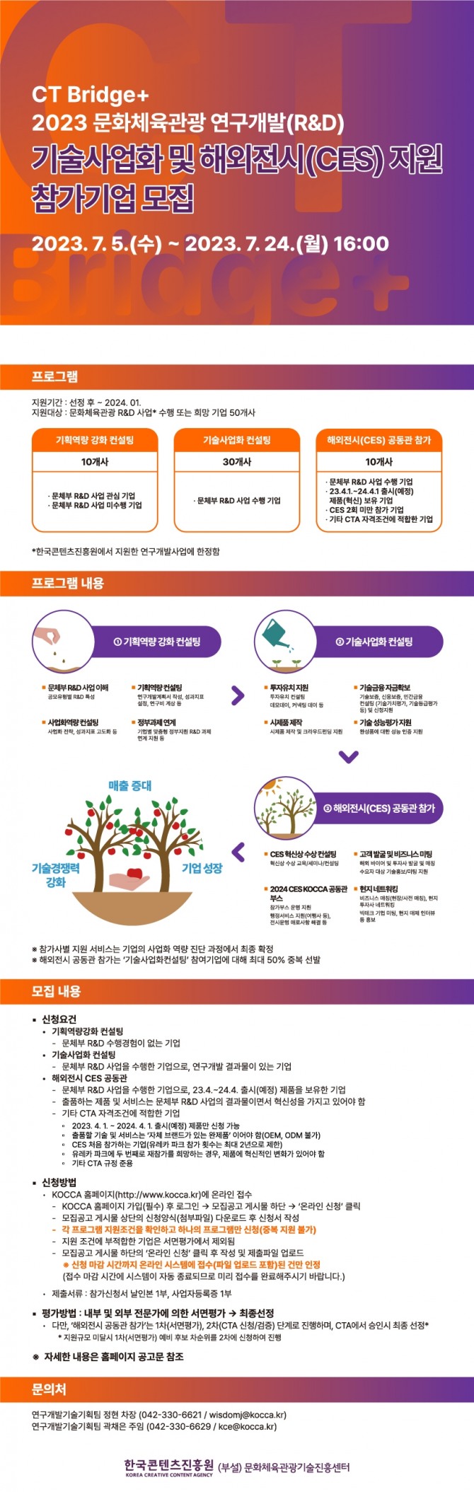 이번 프로그램은 8월부터 24년 1월까지 6개월간 진행되며, 3개 부문에 총 50개사를 모집한다. 문체부 R&D 사업을 수행한 경험이 없는 기업을 대상으로 ▲기획역량 강화 컨설팅(10개사), 경험이 있는 기업을 대상으로 ▲기술사업화 컨설팅(30개사) ▲해외전시(CES) 공동관 참가(10개사)를 지원한다.