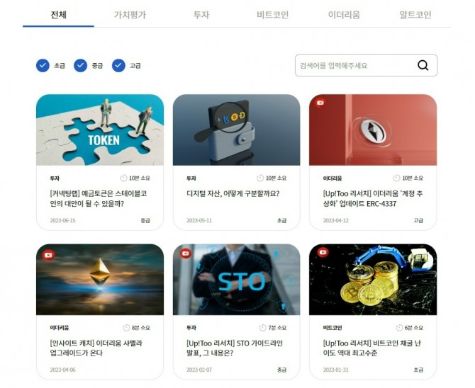 이미지 확대보기대표적인 콘텐츠는 '디지털 자산 교육'이다. 여기에는 암호화폐 투자에 앞서 반드시 알아야 할 콘텐츠에 대해 초급/중급/고급 난이도의 콘텐츠가 87편 등록돼 있다. '디지털 자산, 어떻게 구분할까요?', '[Up!Too 리서치] STO 가이드라인 발표, 그 내용은?', '[커넥팅랩] 예금토큰은 스테이블코인의 대안이 될 수 있을까?' 등 암호화폐 투자자들이 관심을 가질 만한 다양한 정보들이 망라돼 있다.