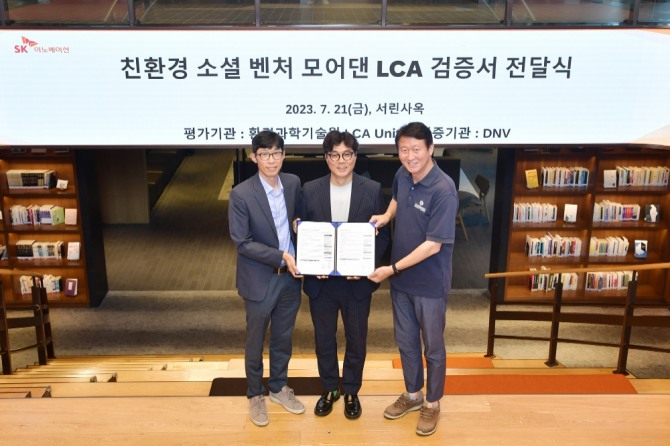 이미지 확대보기SK이노베이션은 서울 종로구에 있는 SK서린빌딩에서 소셜벤처 ‘모어댄’의 업사이클링 제품 전과정평가결과에 대한 제 3자 검증서 수여식을 가졌다고 21일 밝혔다.