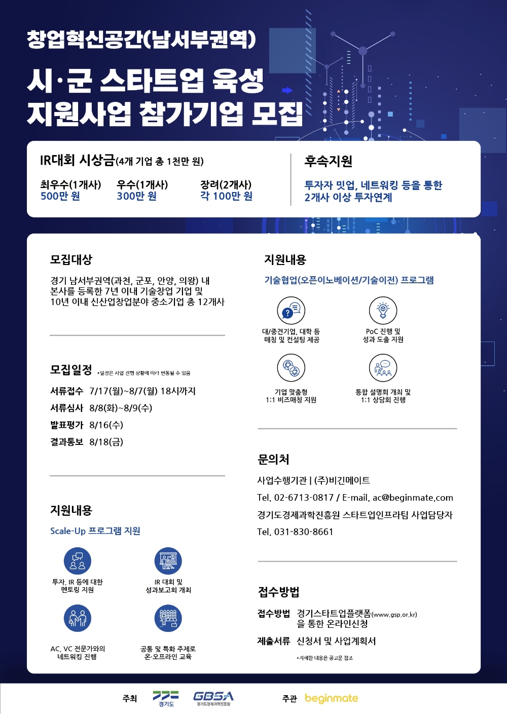 본 사업은 경기 남서부권역 내 혁신적인 비즈니스 아이디어와 창업 의지를 보유한 기업을 대상으로 투자 및 기술협업 등 맞춤형 지원을 통해 성장과 발전의 기회를 제공하는 사업이다.