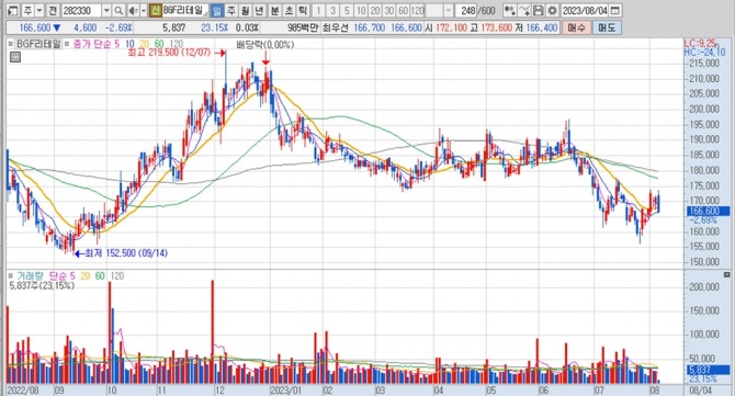 이미지 확대보기BGF리테일의 주가는 4일 오전 9시 30분 현재 전일보다 4600원(2.69%) 내린 16만6600원에 매매되고 있습니다.