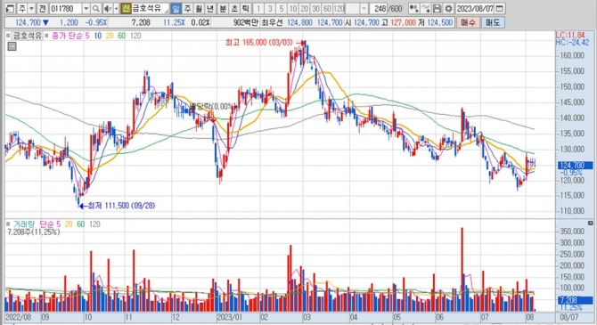 금호석유화학의 지난 1년여간 주가 변동 추이. 키움증권 HTS 캡처이미지 확대보기
