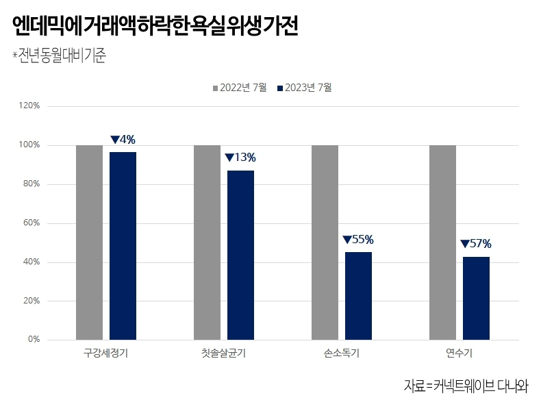 이미지 확대보기반면 엔데믹 여파로 위생과 관련된 가전제품의 거래액은 다소 하락했다. 7월 손소독기의 거래액은 전년 동기 대비 55% 감소했으며, 연수기도 57% 감소했다. 칫솔살균기, 구강세정기 등의 제품도 감소폭을 보였다.