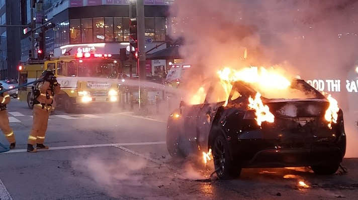지난 6월4일 전북 전주시 덕진구 중동에서 화재가 발갱한 테슬라 전기차를 소방관이 진화하는 모습. 사진=전북소방본부  이미지 확대보기