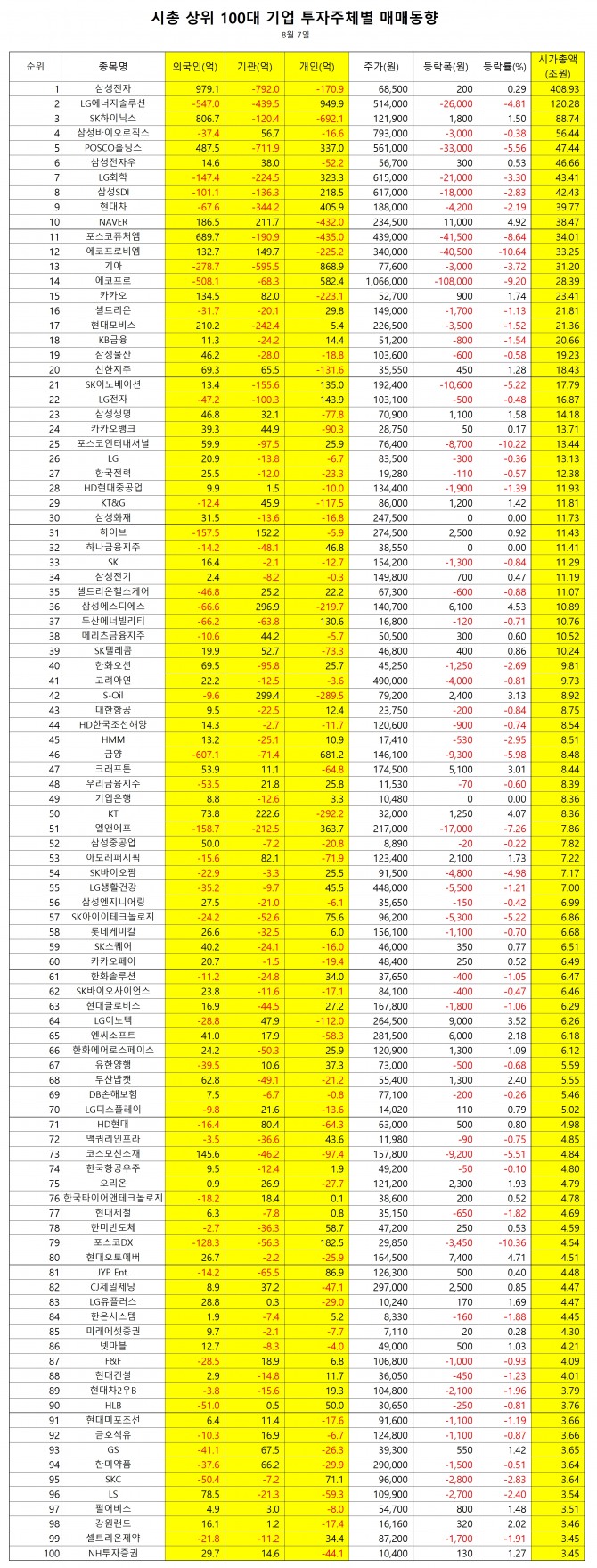 1위 SK하이닉스 -692억원(-56만주), 2위 포스코퓨처엠 -435억원(-10만주), 3위 NAVER -432억원(-18만주), 4위 KT -292억원(-92만주), 5위 S-Oil -290억원(-36만주), 6위 카카오 -223억원(-42만주), 7위 삼성에스디에스 -220억원(-15만주), 8위 삼성전자 -171억원(-24만주), 9위 영풍제지 -142억원(-27만주), 10위 신한지주 -132억원(-37만주), 11위 KT&G -117억원(-14만주), 12위 LG이노텍 -112억원(-4만주), 13위 코스모신소재 -97억원(-6만주), 14위 한국콜마 -90억원(-18만주), 15위 카카오뱅크 -90억원(-31만주), 16위 농심 -80억원(-2만주), 17위 한국금융지주 -79억원(-15만주), 18위 삼성생명 -78억원(-11만주), 19위 SK텔레콤 -73억원(-16만주), 20위 아모레퍼시픽 -72억원(-6만주)