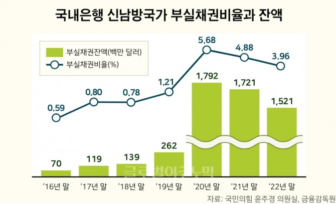 8일 국회 정무위원회 소속 윤주경 국민의힘 의원이 금융감독원으로부터 제출받은 '2016~2023년 국내은행 신남방국가 11개국 진출 추이' 자료에 따르면 2016년 0.59% 수준이던 신남방 소재 점포 NPL 비율은 2022년 말 기준 3.96%까지 치솟았다. 이는 같은 기간 해외점포 평균인 1.50%보다 두 배 이상 높은 수치다.