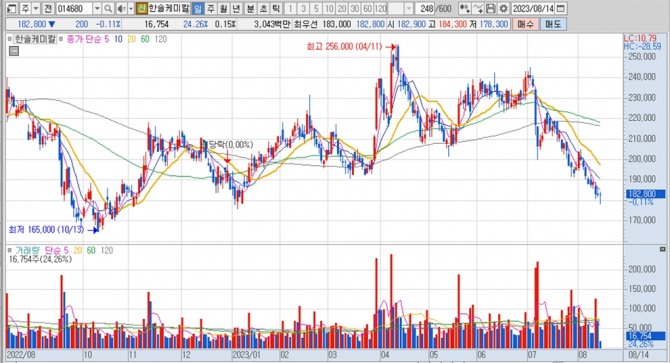 이미지 확대보기한솔케미칼의 주가는 14일 오전 9시 50분 현재 전일보다 200원(0.11%) 내린 18만2800원에 거래되고 있습니다.