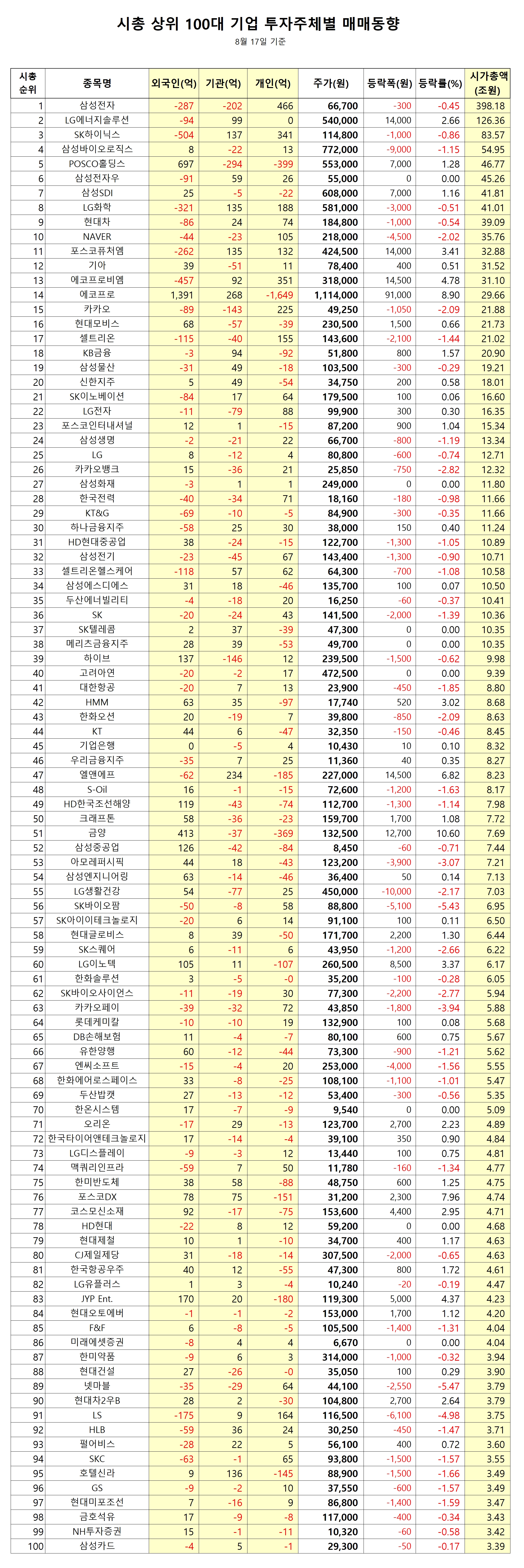 다음은 17일 주식시장에서 국내 주요 투자주체들의 순매수 및 순매도 상위종목들이다.