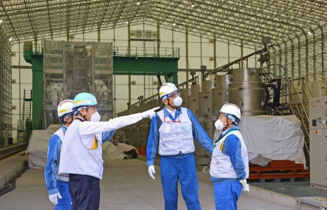 기시다 후미오 일본 총리(왼쪽 세번째)가 20일 오염수(일본 정부 명칭 '처리수') 해양방류를 앞둔 20일 후쿠시마 제1원자력발전소를 방문, 설명듣고 있다. 사진=연합이미지 확대보기