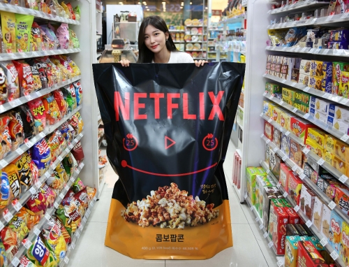 이미지 확대보기GS25가 ‘우리동네GS’앱에서 넷플릭스 컬래버 상품 스탬프 이벤트를 진행한다. 이번 이벤트에서 가장 이목을 끄는 경품은 ‘넷플릭스인간팝콘’이다. 세로 120cm, 가로 93cm 사이즈의 초대형 팝콘으로 안에는 70~80g 일반 사이즈 팝콘보다 8배가량 큰 400g ‘넷플릭스점보팝콘’ 10개가 들어있다. 최근 편의점 대용량 상품이 매출 상승을 견인하는 킬러 콘텐츠로 발돋움하고 있다는 점에서 착안, 차별화 경험을 제공하기 위해 이번 이벤트를 기획했다.