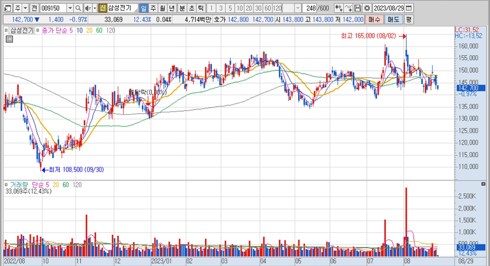 키움증권은 삼성전기의 MLCC(적층세라믹콘덴서) 주도의 실적 개선 추세는 변함이 없지만 IT Set 수요 회복 지연에 따라 실적 개선 강도는 예상보다 미흡할 것으로 전망해 3분기 실적 추정치를 하향하지만 투자의견 매수와 목표주가 20만원을 그대로 유지했습니다.