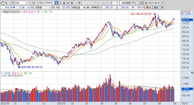 코스닥 지수는 1일 전일보다 8.66포인트(0.93%) 내린 919.74로 장을 마감했다.