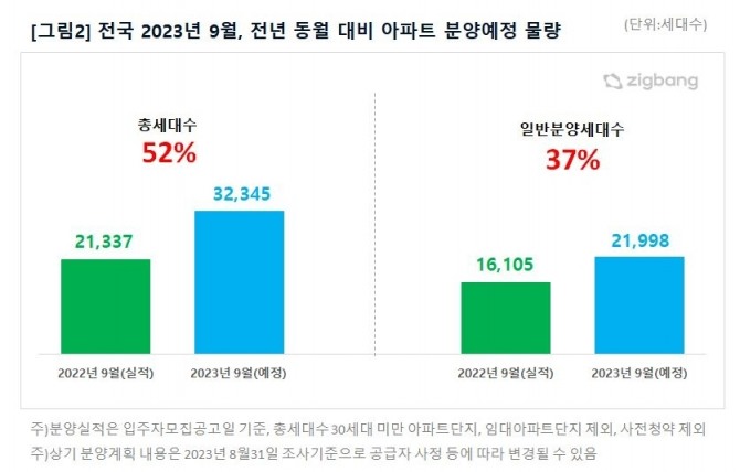 4일 업계에 따르면 이번 달 전국에서 42개 단지, 3만2345가구(30가구 미만·임대·사전청약 제외)가 분양된다. 작년 9월 2만1337가구 대비 52% 많은 물량이다. 이 중 2만1998가구는 일반분양이다.