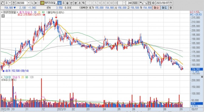 이미지 확대보기BGF리테일의 주가는 7일 오전 9시 3분 현재 전일보다 2100원(1.34%) 내린 15만4900원에 거래되고 있다.