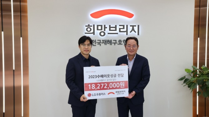 이미지 확대보기8일 희망브리지 전국재해구호협회에 따르면 LG유플러스가 호우와 태풍 등으로 피해를 본 이웃을 위해 써달라며 임직원이 십시일반 모은 성금을 전해왔다.