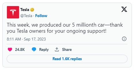 17일(이하 현지시간) 일렉트렉에 따르면 테슬라는 이날 X에 올린 공지문에서 “500만 번째 전기차를 생산하는 기록을 수립했다”고 밝혔다.