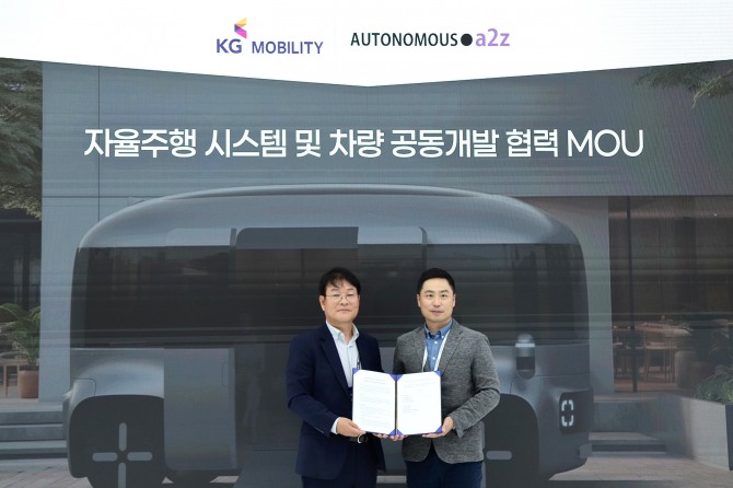 KG모빌리티는 국내 자율주행 소프트웨어 1위 업체인 오토노머스에이투지(AUTONOMOUS a2z)와 자율주행 시스템 개발 협력 및 자율주행차 제조를 위한 양해각서를 체결했다고 24일 밝혔다.