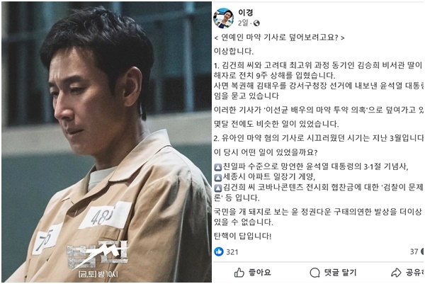 이미지 확대보기배우 이선균의 마약 혐의 형사 입건(피의자 신분 전환)이 윤석열 정부의 실정(실상)을 덮기 위한 공작이라는 음모론이 야권에서 제기되고 있다. 수사 당국의 여론 조작이라는 음모론이다. 이경 더불어민주당 상근부대변인은 지난 21일 페이스북에 '연예인 마약 기사로 덮어보려고요?'라는 제목의 글을 올리며 "이상하다"고 말문을 열었다. 이 부대변인은 "김건희 씨와 고려대 최고위 과정 동기인 김승희 비서관 딸이 학폭 가해자로 전치 9주 상해를 입혔다. 사면 복권해 김태우를 강서구청장 선거에 내보낸 윤석열 대통령에게 책임을 묻고 있다"며 "이런 기사가 '이선균 배우의 마약 투약 의혹'으로 덮여가고 있다"고 주장했다. 그는 "몇 달 전에도 비슷한 일이 있었다"며 여러 종류의 마약을 상습 투약한 혐의로 재판에 넘겨진 배우 유아인에 대해서도 의혹을 제기했다. 사진은 지난 1~2월 방송된 이선균 주연 SBS 드라마 ‘법쩐’ 스틸컷과 이경 민주당 상근부대변인 페이스북 캡처. 사진=이선균 인스타그램, SBS, 이경 부대변인 페이스북