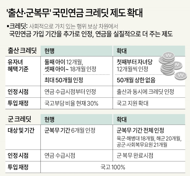 이미지 확대보기출산 크레딧은 첫째 아이부터, 군 크레딧은 전체 복무를 인정해주기로 했다.