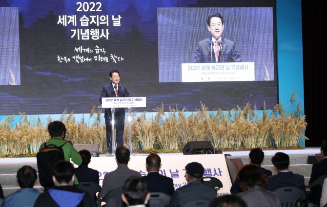 전라남도가 갯벌의 지속 가능한 이용 및 효율적 보전‧관리를 위한 ‘전남도 갯벌 보전·관리 종합계획’을 수립했다. 사진은 김영록 전라남도지사가 지난 2022년 4월 22일 보성 벌교생태공원에서 열린 세계 습지의 날 기념식에서 축사하는 모습. 사진=전남도