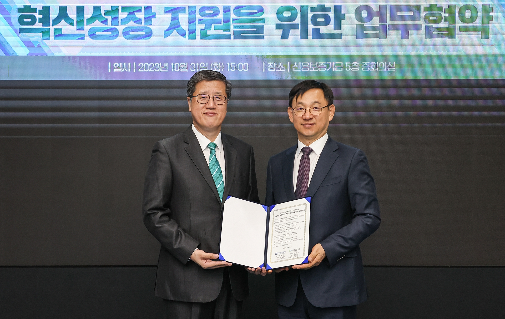 이미지 확대보기최원목 신용보증기금 이사장(왼쪽)과 전윤종 한국산업기술기획평가원 원장(오른쪽)이 지난 10월 31일 신용보증기금 본점에서 열린 '산업기술 R&D 기업의 혁신성장 지원을 위한 업무협약'에 참석해 기념 촬영을 하고 있다. 사진=신용보증기금