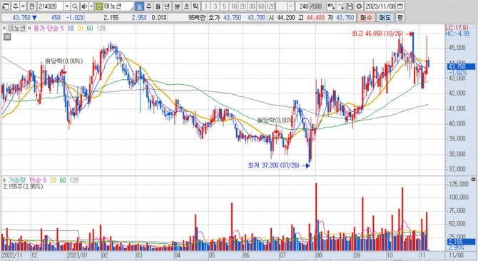 이미지 확대보기이노션의 주가는 8일 오전 9시 3분 현재 전일보다 450원(1.02%) 내린 4만3750원에 거래되고 있다.