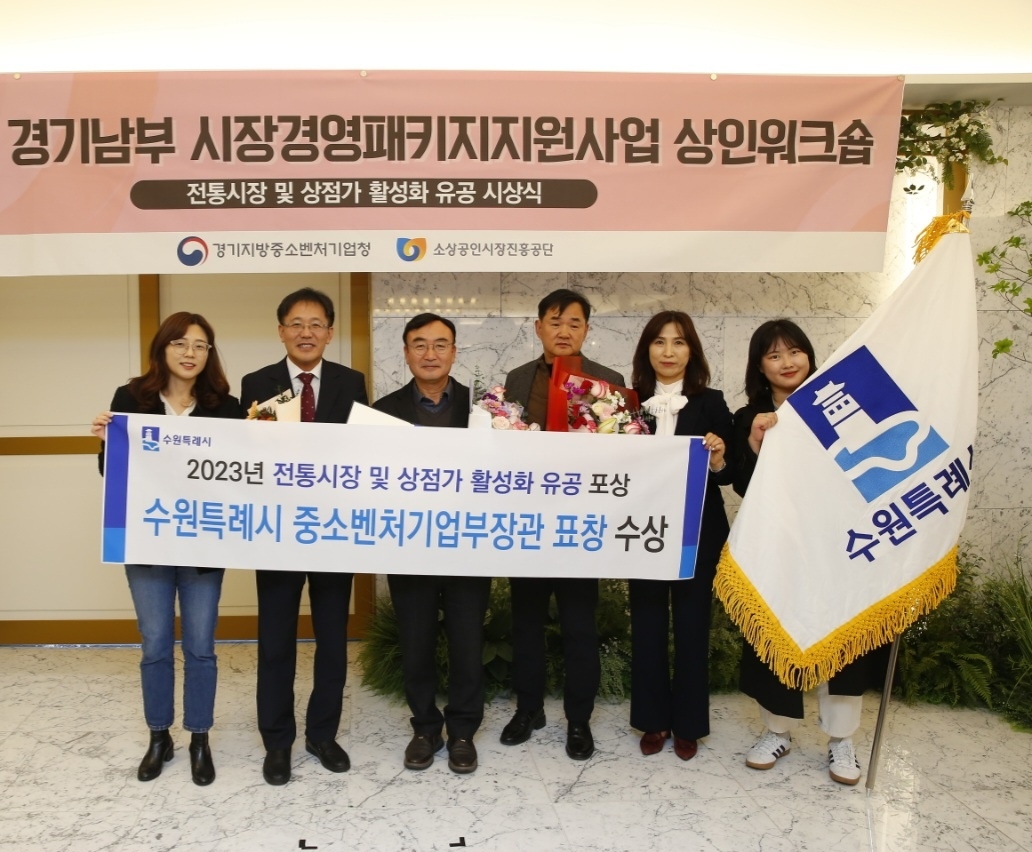 이미지 확대보기이번 포상은 중소벤처기업부가 전통시장·상점가 활성화에 기여한 우수시장·상인, 지원기관·단체 등의 사기진작 및 자긍심 고취를 위해 수여하는 상이다. 경기도에서는 수원시가 유일하게 중소벤처기업부 장관상을 수상했다.