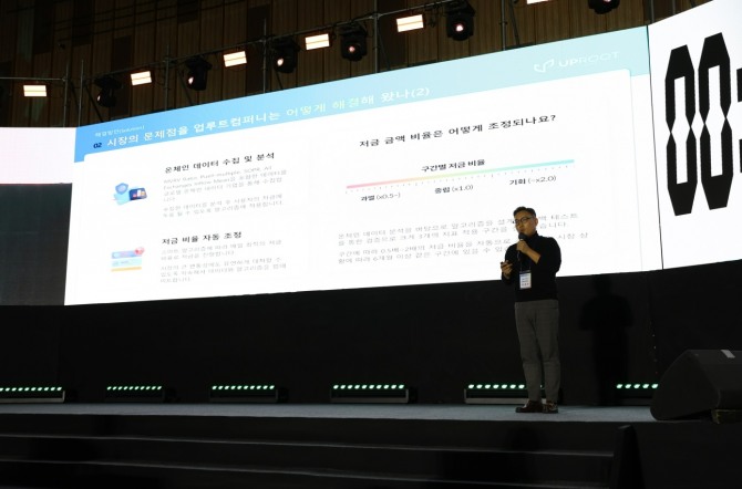 이미지 확대보기이장우 업루트컴퍼니 대표가 자사의 적립식 투자 솔루션 ‘비트세이빙’에 대해 설명하고 있다. 사진=업루트컴퍼니